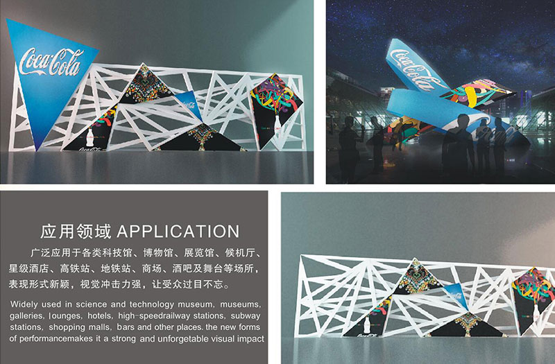 1、根據需要拼接成菱形、三角形等多邊形顯示屏,用作室內墻面、地面的裝飾。