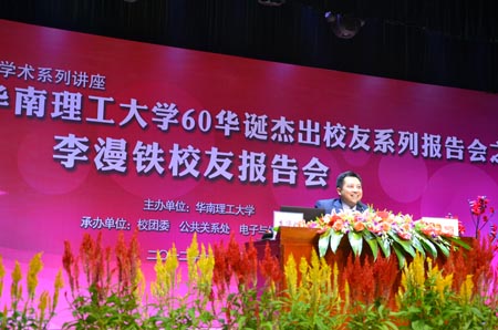 時(shí)逢華南理工大學(xué)60周年“甲子”校慶,作為本次校慶活動(dòng)的重要內(nèi)容“60華誕杰出校友報(bào)告會(huì)”,應(yīng)華南理工大學(xué)校領(lǐng)導(dǎo)、校友總會(huì)盛情邀請(qǐng),李漫鐵董事長(zhǎng)于11月1日重返母校,與在校師生共同分享了一場(chǎng)主題為“磨礪自身,成就夢(mèng)想”的報(bào)告演講。
