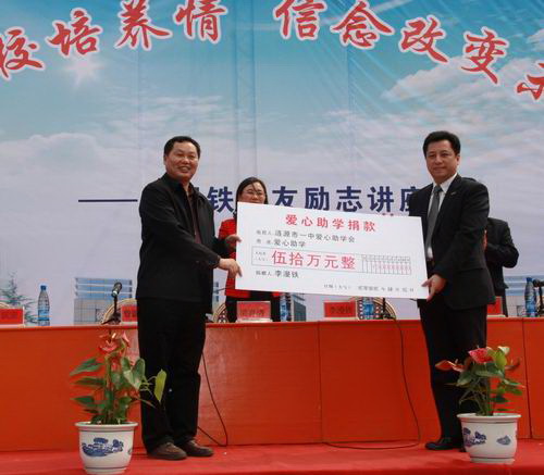 漫步校園,面對母校滿目蔥蘢的綠意和掩映其中的現(xiàn)代建筑群體,回想昔日的寒窗苦讀生活,李董事長校友臉上掩飾不住澎湃的心情,話語也多了幾許。第二天舉行的漣源一中82級部分校友座談會上,李漫鐵董事長校友表示:感恩母校老師培養(yǎng)情,我為母校捐資50萬元,這是我個人的第一筆捐款。并將盡己所能籌集更多的愛心助學(xué)款,獎勵優(yōu)秀學(xué)生,資助家庭困難學(xué)生完成高中學(xué)業(yè),促進(jìn)母校的繁榮發(fā)展。
