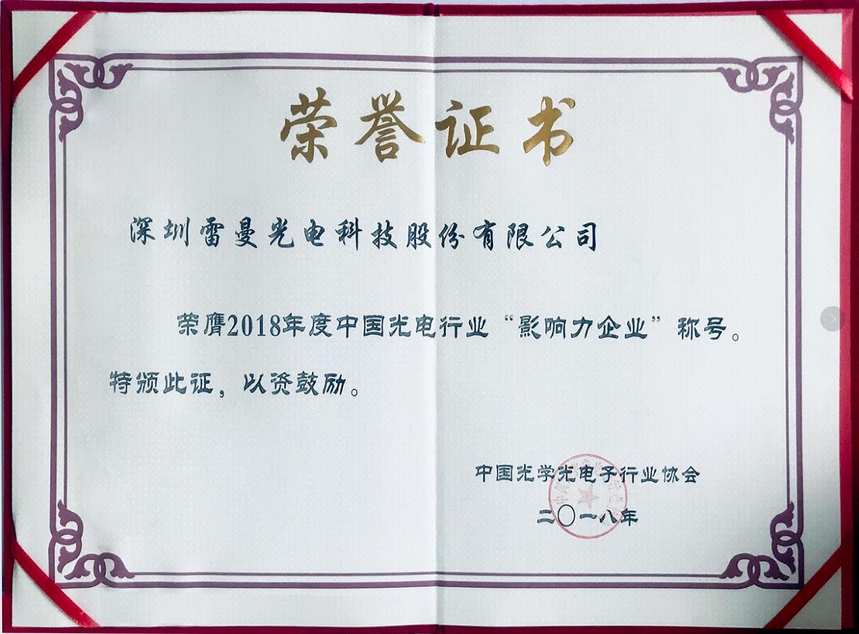 中國(guó)光學(xué)光電子行業(yè)協(xié)會(huì)自2015年開(kāi)始舉辦光電行業(yè)年度“影響力企業(yè)”“持續(xù)進(jìn)步企業(yè)”“社會(huì)貢獻(xiàn)企業(yè)”評(píng)選活動(dòng)至今三年,已成為光電行業(yè)較有影響力的評(píng)選活動(dòng)之一,得到了業(yè)內(nèi)的較高關(guān)注和認(rèn)可。此獎(jiǎng)項(xiàng)的評(píng)選旨在鼓勵(lì)先進(jìn)、樹(shù)立榜樣、塑造有行業(yè)公信力的社會(huì)品牌,引導(dǎo)行業(yè)良性快速發(fā)展。2018年評(píng)選活動(dòng)經(jīng)過(guò)評(píng)選資料篩選、網(wǎng)絡(luò)投票、專家打分及評(píng)審會(huì)的綜合評(píng)定,選出2018年度“影響力企業(yè)”、“持續(xù)進(jìn)步企業(yè)”和“社會(huì)突出貢獻(xiàn)企業(yè)”,以及優(yōu)秀工作者、行業(yè)貢獻(xiàn)獎(jiǎng)。雷曼光電憑借公司綜合實(shí)力榮獲2018年度中國(guó)光電行業(yè)“影響力企業(yè)”大獎(jiǎng)。