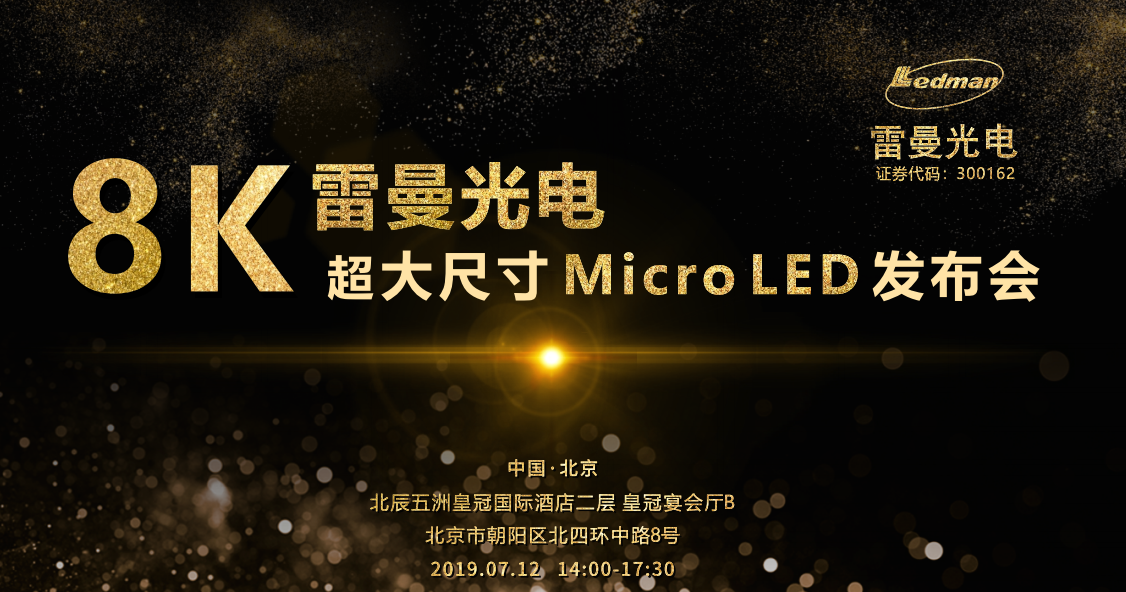 深圳雷曼光電科技股份有限公司將于2019年7月12日下午在北京五洲皇冠國際酒店通過發(fā)布會正式發(fā)布324吋8K超高清Micro LED顯示屏。
