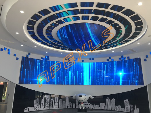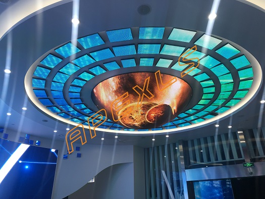 根據(jù)展廳現(xiàn)有的整體造型及需要呈現(xiàn)的展示效果,雷曼-康碩展采用P4規(guī)格、3M直徑的半球屏設(shè)計(jì)方案。半球屏的造型設(shè)計(jì)很好地解決了不規(guī)則結(jié)構(gòu)的難題,整個(gè)顯示屏所顯現(xiàn)的時(shí)尚科技效果與展廳環(huán)境很好的融為一體。當(dāng)半球屏屏體燈光與其他屏體燈光相互交匯,站在展廳如置身信息的云端,給人強(qiáng)烈的視覺(jué)沖擊。