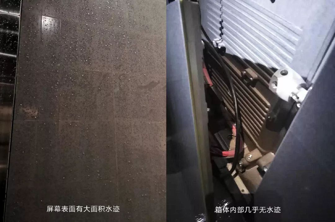 安裝工程師即刻在現場拆下模組進行檢查,經排查,告知監(jiān)理、校方及施工單位,經過“洗禮”的箱體內部并沒有明顯水跡,而屏體表面的水漬,用抹布拭擦干凈即可。