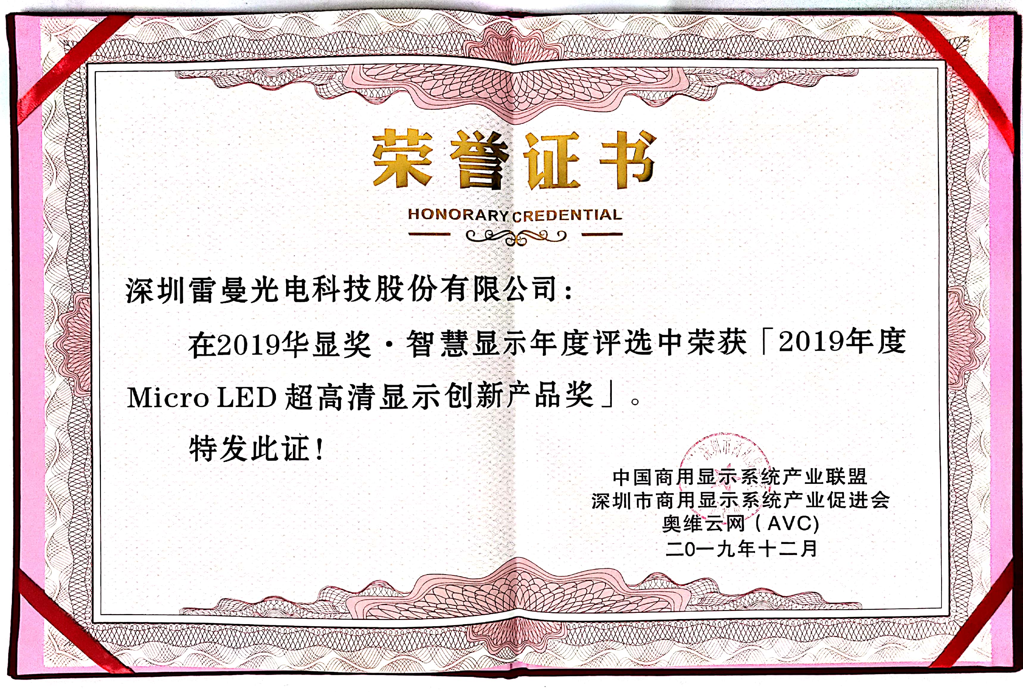 通過大數(shù)據(jù)采集、自主報名、微信投票、專家評審等多個環(huán)節(jié)的層層評選,雷曼光電憑榮獲2019華顯獎?智慧顯示“2019年度Micro LED超高清顯示創(chuàng)新產(chǎn)品獎”。