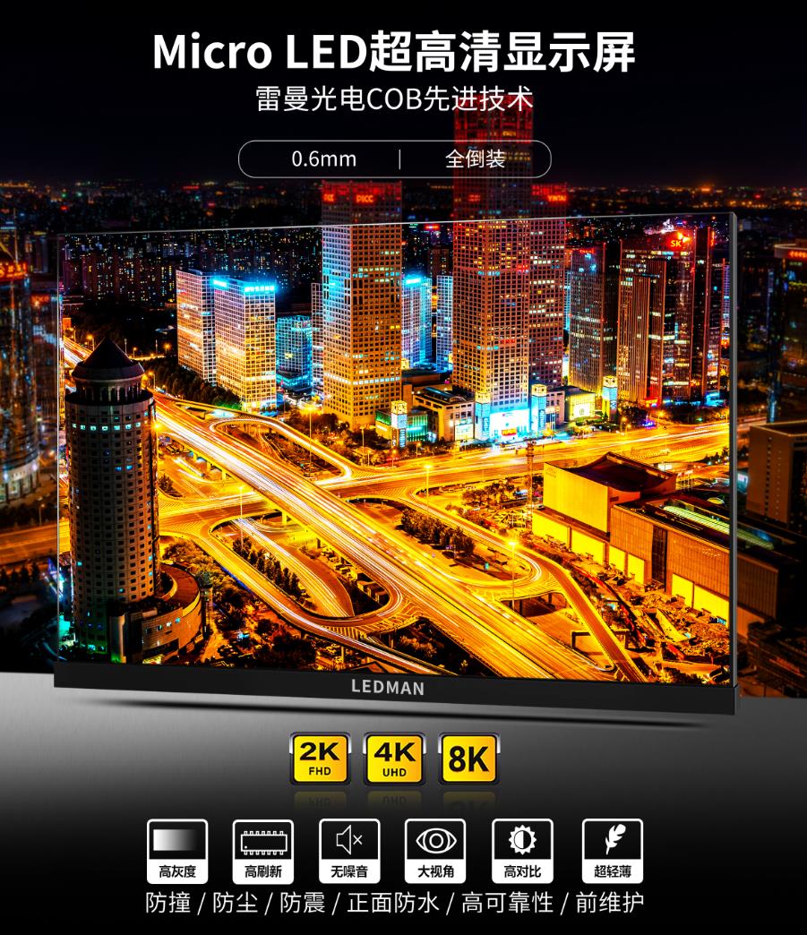 雷曼新一代基于COB技術(shù)的超高清0.6mm間距Micro LED顯示屏產(chǎn)品,仍然與上一代COB產(chǎn)品相同,采用顯示單元拼接方式,可以無限拼接形成各種尺寸的顯示屏。雷曼也提供標(biāo)準(zhǔn)尺寸的0.6mm間距Micro LED顯示產(chǎn)品,包括54吋的2K Micro LED顯示屏、108吋的4K Micro LED顯示屏,以及216吋的8K Micro LED顯示屏產(chǎn)品,與雷曼2019年7月發(fā)布的0.9mm間距的324吋8K Micro LED相比,0.6mm間距的216吋的8K Micro LED顯示產(chǎn)品,技術(shù)更加先進(jìn)。雷曼光電的新一代0.6mm間距Micro LED,可根據(jù)各行各業(yè)的客戶需求進(jìn)行模塊化拼接定制,滿足專業(yè)顯示和商業(yè)顯示的各類超大尺寸顯示應(yīng)用需求,如指揮監(jiān)控中心、商業(yè)中心、廣電中心、展覽展示、高端會議中心、私人影院等。在即將到來的5G+8K時代,雷曼新一代0.6 mm間距Micro LED的54吋2K、108吋4K、216吋8K標(biāo)準(zhǔn)產(chǎn)品, 與5G的超高清視頻應(yīng)用可謂是珠聯(lián)璧合,為5G時代下的超高清視頻應(yīng)用添磚加瓦。