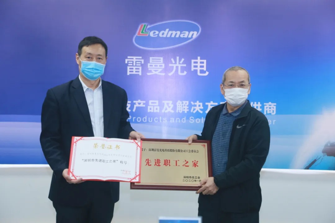 2020年4月14日上午,深圳市南山區(qū)西麗街道總工會張家雄主席、陽光工作站何呈舉副站長等領(lǐng)導(dǎo)一行蒞臨雷曼光電,為雷曼工會頒發(fā)“深圳市先進(jìn)職工之家”的牌匾與榮譽(yù)證書。