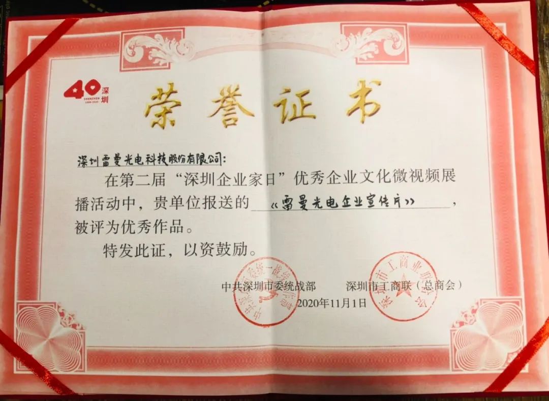 市委常委、統(tǒng)戰(zhàn)部部長(zhǎng)杜玲,市直機(jī)關(guān)和各區(qū)領(lǐng)導(dǎo),深圳優(yōu)秀企業(yè)負(fù)責(zé)人代表、媒體記者等200余人將共襄盛舉。同時(shí),“首屆深圳優(yōu)秀企業(yè)文化微視頻大賽”獲獎(jiǎng)名單公布,《雷曼光電企業(yè)宣傳片》視頻在332個(gè)作品中脫穎而出,與其他39家公司作品一同獲得“深圳企業(yè)文化微視頻優(yōu)秀作品獎(jiǎng)”。
