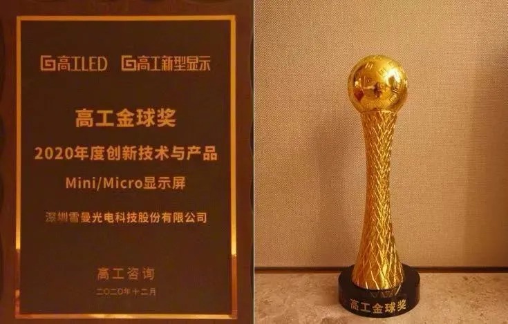 到2020年,在高工LED年會暨金球獎頒獎典禮上,雷曼光電憑借其基于COB技術(shù)的Micro LED超高清顯示產(chǎn)品獲得2020高工金球獎評選年度創(chuàng)新技術(shù)與產(chǎn)品獎“Micro LED顯示屏”類別最高榮譽金球獎。