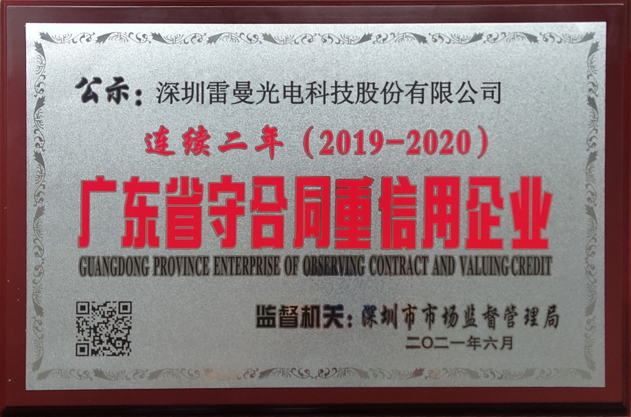 人無信不立,業(yè)無信不興。誠信經(jīng)營是企業(yè)持續(xù)發(fā)展的基石。近日,廣東省市場監(jiān)督管理局再次授予雷曼光電2020年度“廣東省守合同重信用企業(yè)”榮譽稱號,以表彰我司在守信經(jīng)營方面的突出表現(xiàn),這是雷曼光電堅持守法經(jīng)營、深入推動誠信合作所取得的成果。