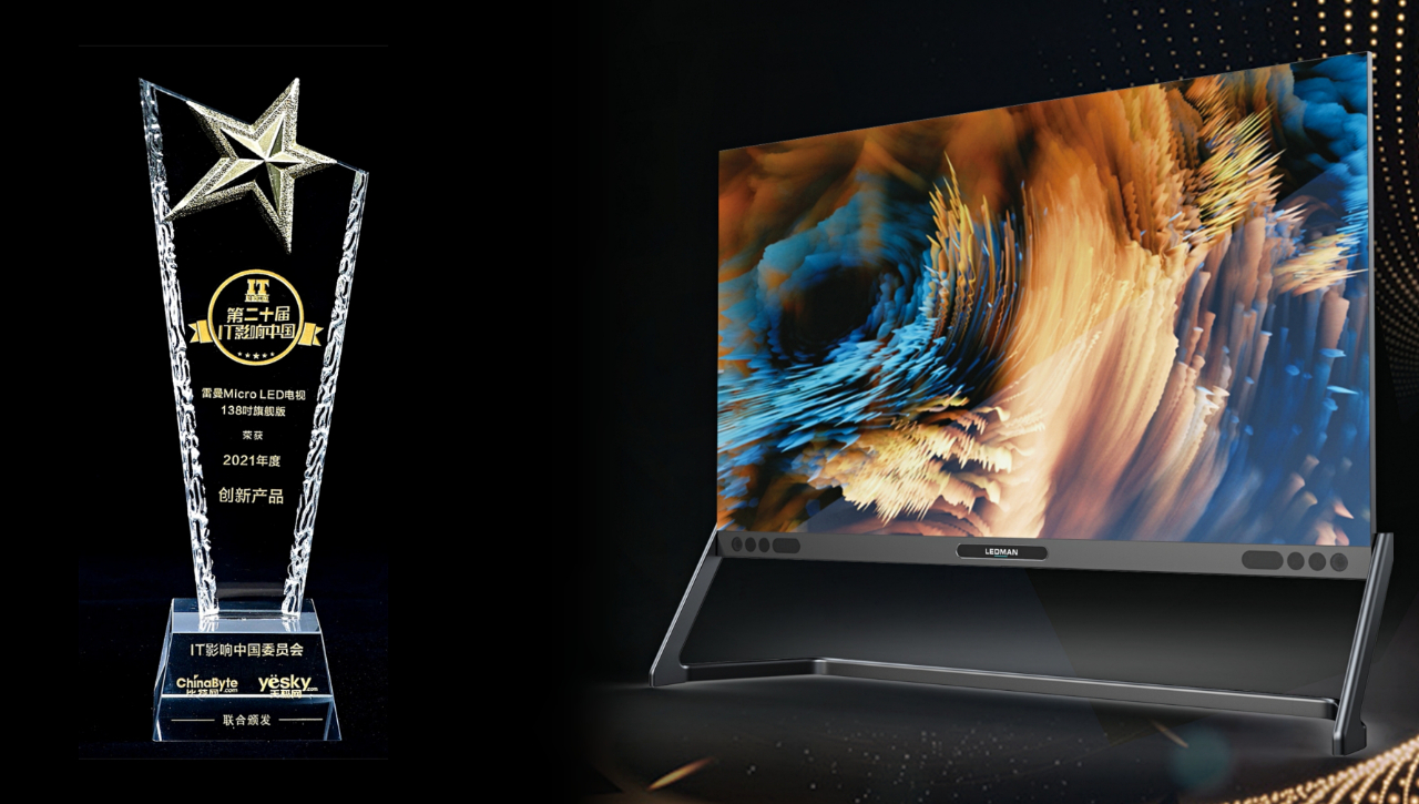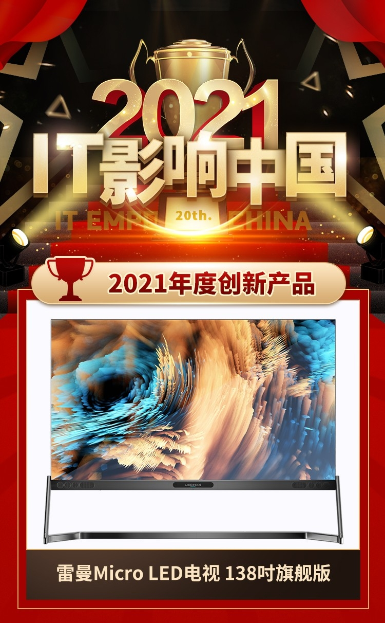 近日,第二十屆“IT影響中國”年度評選結(jié)果正式揭曉。雷曼巨幕LEDPLAY?138吋旗艦版榮獲IT影響中國“2021年度創(chuàng)新產(chǎn)品”獎。