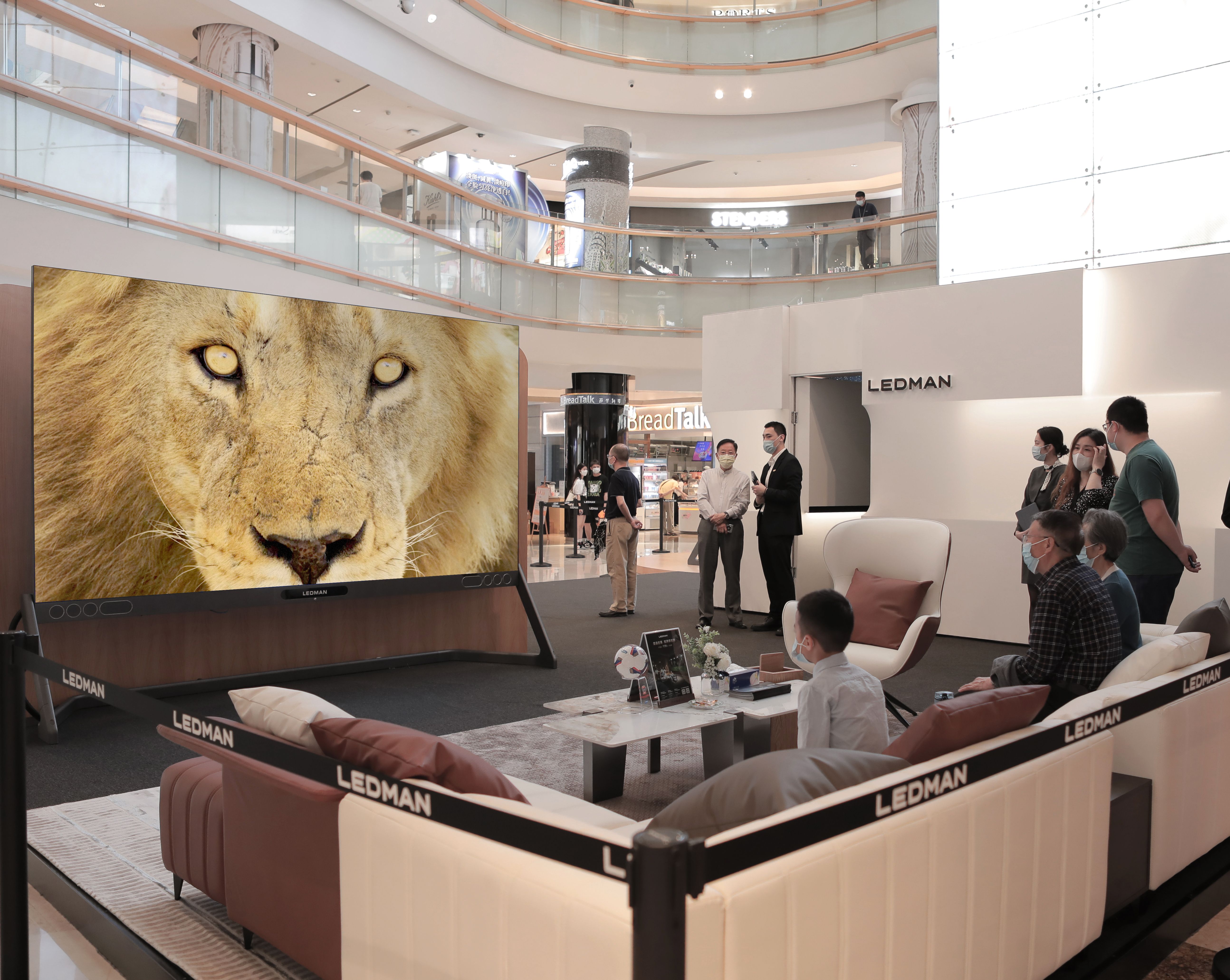 此次,雷曼為LEDMAN雷曼巨幕線下快閃店全球首展搭建了兩個沉浸式場景,開放式的客廳場景搭配落地安裝的138吋雷曼巨幕,在宇宙魔方內部的私人影院場景,則配備了165吋嵌入式雷曼巨幕墻。