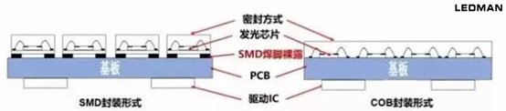 COB封裝工藝的LED顯示屏,很容易做到這點(diǎn)。如果我們有機(jī)會把COB的LED顯示屏與SMD的LED顯示屏放在一起,可以很容易發(fā)現(xiàn):COB的LED顯示屏發(fā)光柔和像面光源,SMD的LED顯示屏則明顯感覺到發(fā)光顆粒是一個(gè)個(gè)獨(dú)立的發(fā)光點(diǎn)。從圖3可知道,COB封裝的密封方式和SMD的密封方式有顯著不同。COB封裝的密封方式是很多個(gè)發(fā)光像素在一起的整體發(fā)光面。SMD封裝的密封方式是單個(gè)發(fā)光像素,是一個(gè)個(gè)的獨(dú)立發(fā)光點(diǎn)。