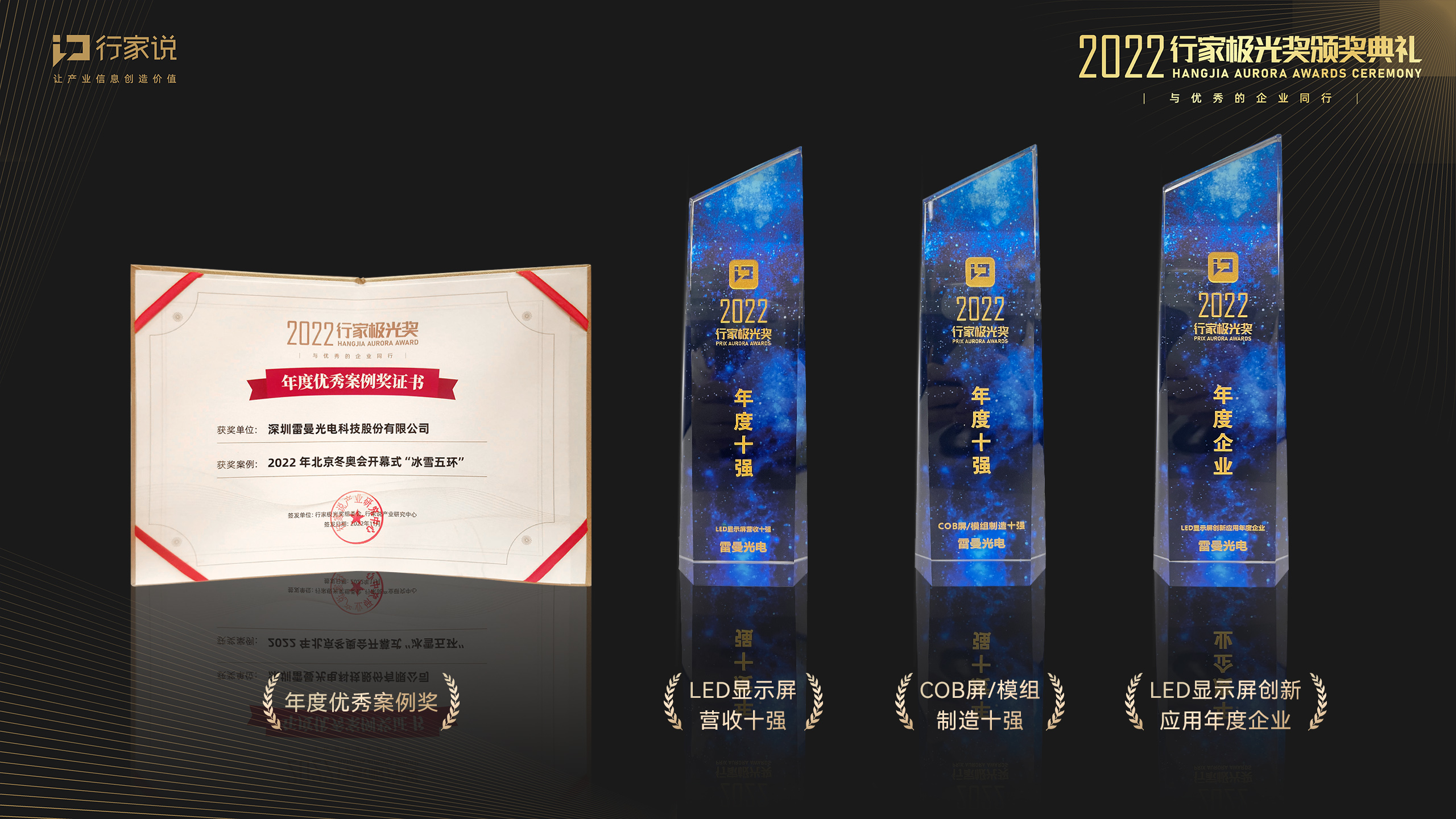 秋風(fēng)送喜,雷曼捷報(bào)頻傳。憑借在LED領(lǐng)域的硬核實(shí)力,雷曼于近日先后斬獲2022年第五屆智慧安防優(yōu)秀解決方案獎,2022行家極光獎(“LED顯示屏營收十強(qiáng)”、“COB屏/模組制造十強(qiáng)”、“LED顯示屏創(chuàng)新應(yīng)用年度企業(yè)”、“年度優(yōu)秀案例”)等多項(xiàng)行業(yè)大獎。