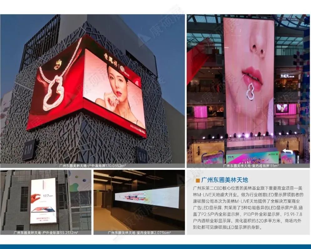 作為行業(yè)創(chuàng)意LED顯示屏領(lǐng)航者的雷曼康碩展為美林M·LIVE天地提供了全解決方案商業(yè)廣告LED顯示屏,采用了P2.5戶內(nèi)全彩顯示屏、P10戶外全彩顯示屏、P3.91-7.8 戶內(nèi)透明全彩顯示屏等3種功能各異的LED顯示屏產(chǎn)品,亮化面積約320多平方米,全方位的為整個(gè)商業(yè)體賦能,提升商業(yè)價(jià)值,商場(chǎng)內(nèi)外到處都可見(jiàn)康碩展LED顯示屏的身影。
