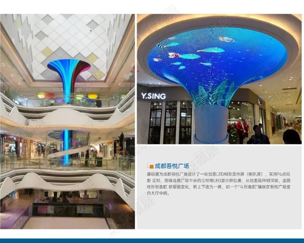 雷曼康碩展為成都吾悅廣場(chǎng)設(shè)計(jì)了創(chuàng)意LED樹(shù)形顯示屏(喇叭屏),采用P6點(diǎn)間距定制,圍繞連接廣場(chǎng)中央的立柱做LED顯示屏包裹,從地面延伸到頂端,由圓柱形到魚(yú)缸狀緩緩變化,將上下連為一體,如一個(gè)“斗形魚(yú)缸”鑲嵌在吾悅廣場(chǎng)室內(nèi)大廳中間。