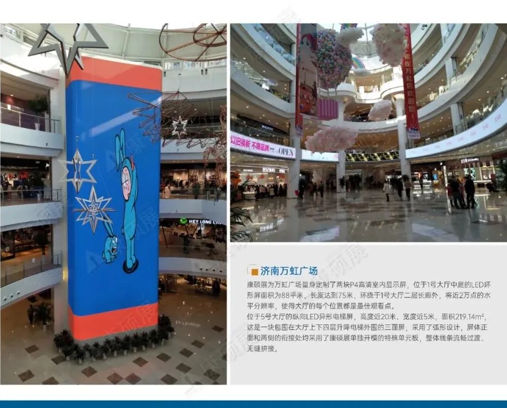 雷曼康碩展為濟(jì)南萬(wàn)虹廣場(chǎng)量身定制了兩塊P4高清室內(nèi)顯示屏,1號(hào)大廳中庭的LED環(huán)形屏面積為88平米,長(zhǎng)度達(dá)75米,水平分辨率將近2萬(wàn)點(diǎn),環(huán)繞于1號(hào)大廳二層長(zhǎng)廊外,使得大廳的每個(gè)位置都是最佳觀看點(diǎn)。5號(hào)大廳的縱向LED異形電梯屏采用了弧形設(shè)計(jì),屏體正面和兩側(cè)的銜接處均采用了康碩展異形設(shè)計(jì),高度近20米、寬度近5米,面積達(dá)219.14m2,三面屏將大廳上下四層升降電梯包圍??荡T展定制的LED顯示屏整體線條流暢過(guò)渡、無(wú)縫拼接,外觀創(chuàng)意十足,為萬(wàn)虹廣場(chǎng)增添了獨(dú)特的魅力,讓購(gòu)物充滿多重樂(lè)趣,成為萬(wàn)虹廣場(chǎng)一道亮麗的風(fēng)景線。
