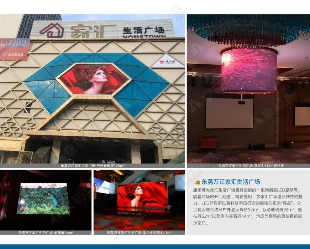 雷曼康碩展為東莞萬(wàn)江家匯生活廣場(chǎng)量身定制了總面積達(dá)366 m2的創(chuàng)意LED顯示屏,隨著商場(chǎng)的開(kāi)門(mén)迎客,精彩亮相,為家匯廣場(chǎng)增添獨(dú)特的魅力。LED異形屏以高科技手段打造商場(chǎng)的視覺(jué)“亮點(diǎn)”,兩塊97m2的六邊形戶外顯示屏、96m2的互動(dòng)地磚屏、32m2的圓柱屏以及44m2的室內(nèi)高清屏,均成為商場(chǎng)眩目的展示窗口。