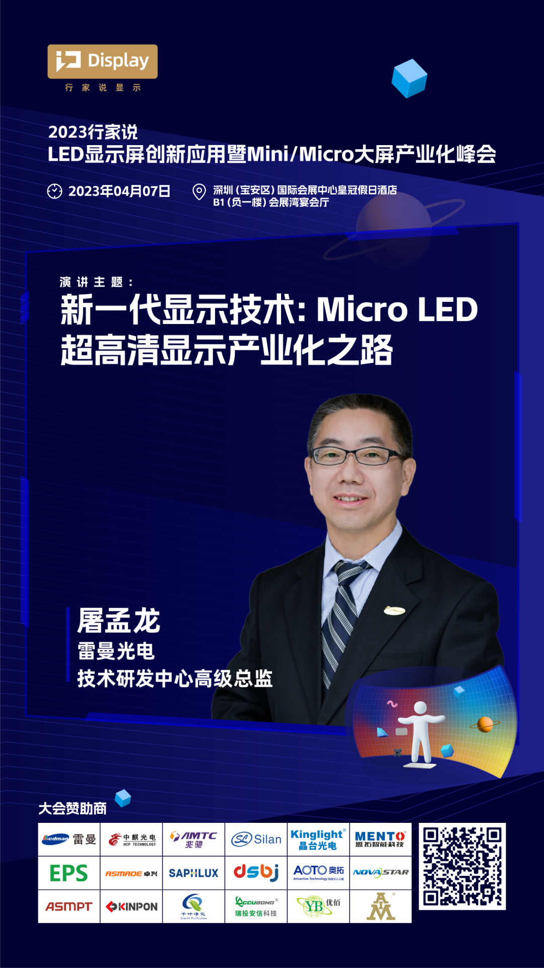 最新消息!雷曼光電技術研發(fā)中心高級總監(jiān)屠孟龍將蒞臨2023年4月7日「行家說·LED顯示屏創(chuàng)新應用暨Mini/Micro大屏產業(yè)化峰會」,并帶來《新一代顯示技術:Micro LED超高清顯示產業(yè)化之路》的主題分享,敬請期待!