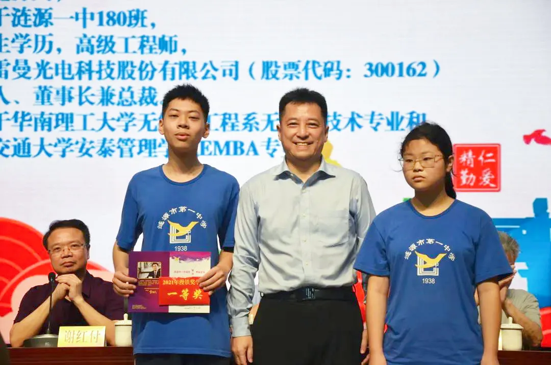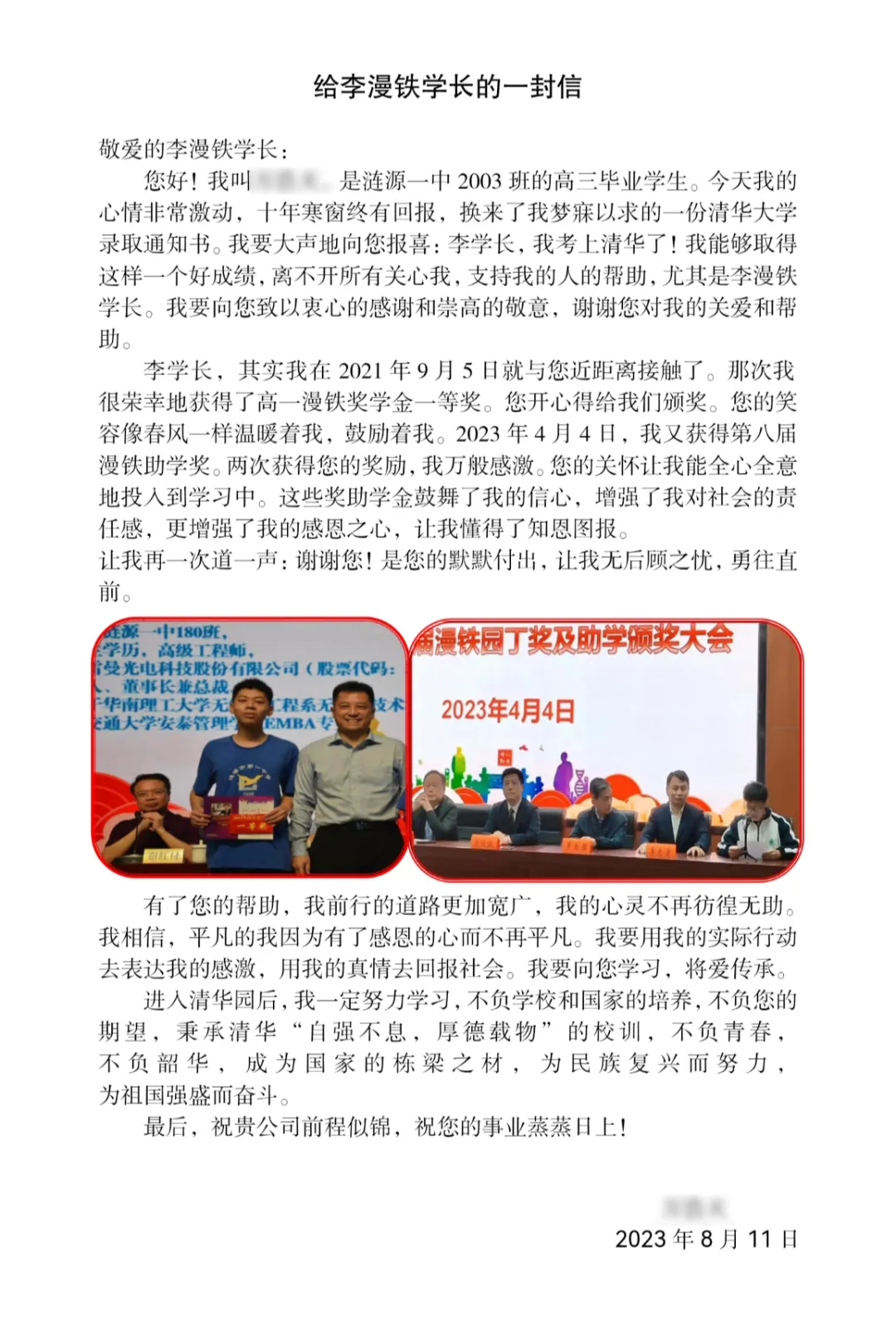 李漫鐵系漣源一中高180班校友,于2012年在母校漣源一中設(shè)立“漫鐵獎學(xué)金”“漫鐵助學(xué)金”“漫鐵園丁獎”,每年出資30余萬元獎助師生200余人,十一年來,共計捐資達400余萬元。暑期組織優(yōu)秀教師代表和優(yōu)秀學(xué)生代表前往深圳進行游學(xué)交流,豐富了師生的閱歷和知識儲備。他還為漣源一中捐贈LED超高清顯示屏,為學(xué)校的日常教學(xué)工作提供了有力的支持。