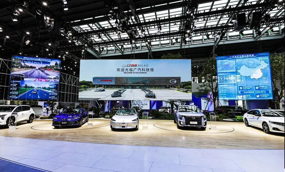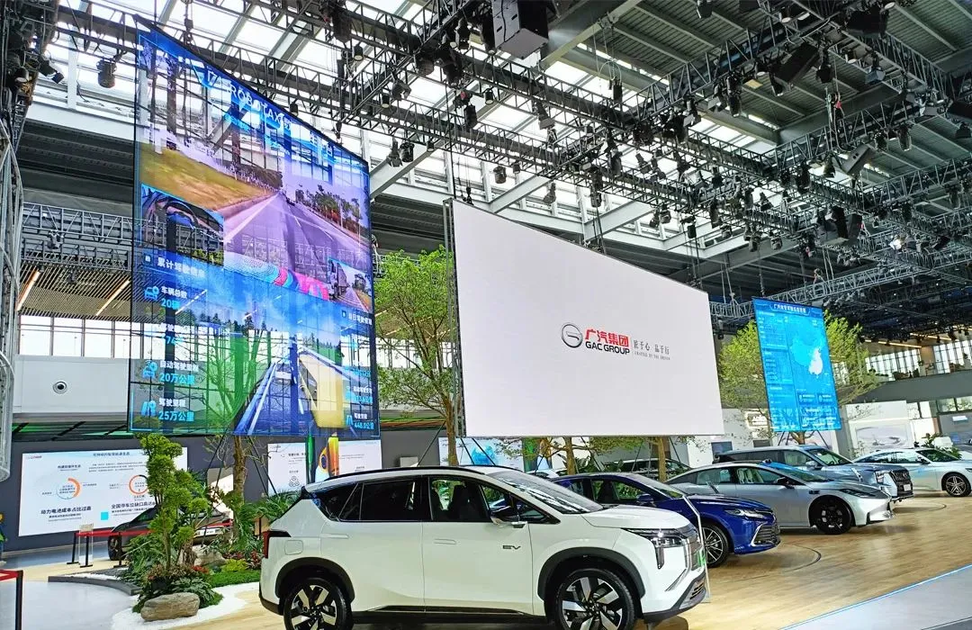 進入館內(nèi),首先映入眼簾的便是展陳的炫酷明星車型以及背景大屏,大屏采用一塊COB小間距屏、兩塊透明冰屏,超清畫質(zhì)與通透畫面組合顯示,向訪客呈現(xiàn)廣汽的品牌發(fā)展歷程、數(shù)字孿生平臺與埃安車輛運營數(shù)據(jù)。