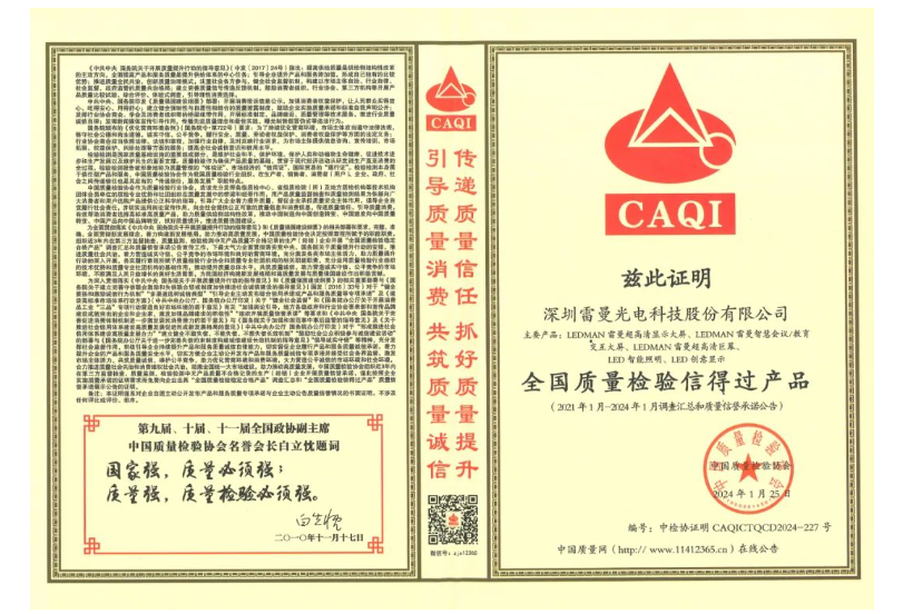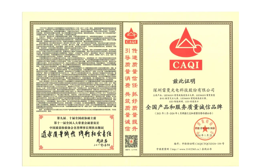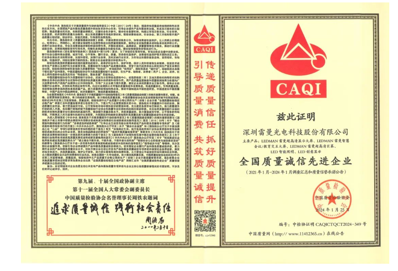 在“國際消費者權(quán)益日”來臨之際,雷曼光電榮獲“全國產(chǎn)品和服務(wù)質(zhì)量誠信品牌”、“全國質(zhì)量誠信先進企業(yè)”、“全國質(zhì)量檢驗信得過產(chǎn)品”等多項權(quán)威認證。這一榮譽不僅是對雷曼光電一直以來對質(zhì)量的堅守和承諾的肯定,也是對消費者的信賴和支持的回饋。