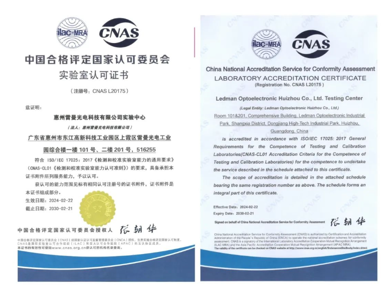 近日,雷曼光電全資子公司惠州雷曼光電科技有限公司實驗中心喜迎佳音,成功通過CNAS實驗室認(rèn)可并榮獲證書,標(biāo)志著惠州雷曼實驗中心的硬件設(shè)施、檢測能力、專業(yè)技術(shù)、管理水平均達到國際認(rèn)可標(biāo)準(zhǔn)。