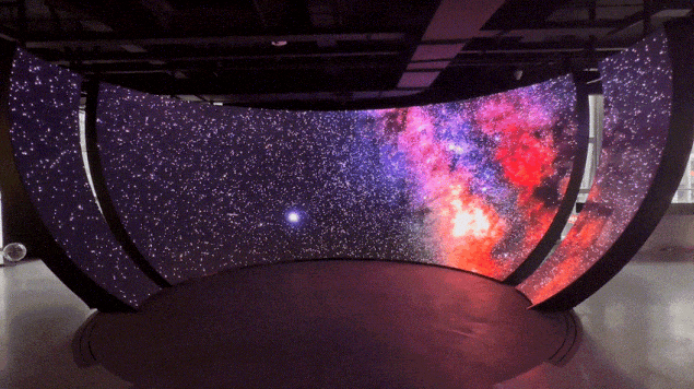 繼續(xù)深入探索零一學院,從未見過的“宇宙星圖”在此展開,璀璨星河撲面而來。雷曼康碩展在LED內球幕基礎上開發(fā)設計的曲面碗屏,直徑6.3米,兩側分屏采用可移動開合的靈活設計,能夠提供多樣化的沉浸式視聽享受,讓前來的訪客仿佛站在浩瀚星河當中,仰望宇宙伸手即可摘下星辰。