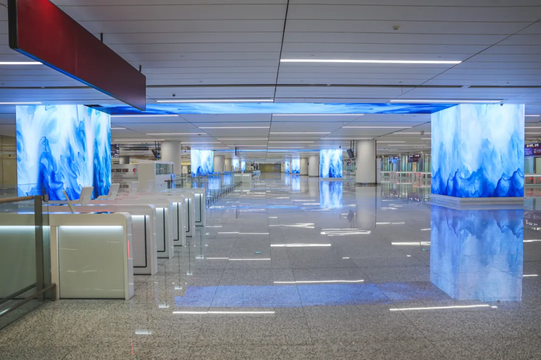國內(nèi)行李廳出口攔河LED大屏整合地鐵、城際、大巴時刻表,實現(xiàn)“空鐵陸”交通一鍵可視化切換,提升中轉(zhuǎn)效率。