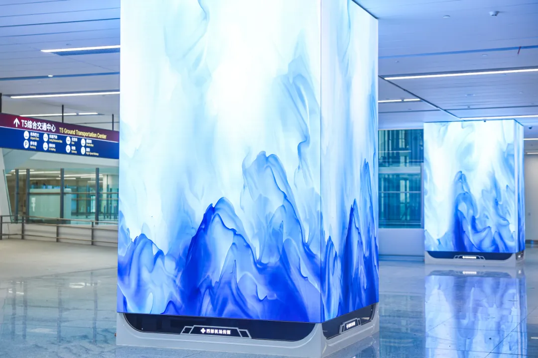 安檢區(qū)域迎賓柱屏作為旅客抵達的第一視覺焦點,動態(tài)展示兵馬俑、大雁塔等文化IP,配合唐代紋樣數(shù)字藝術(shù)渲染,讓科技屏變身“文化大使”。