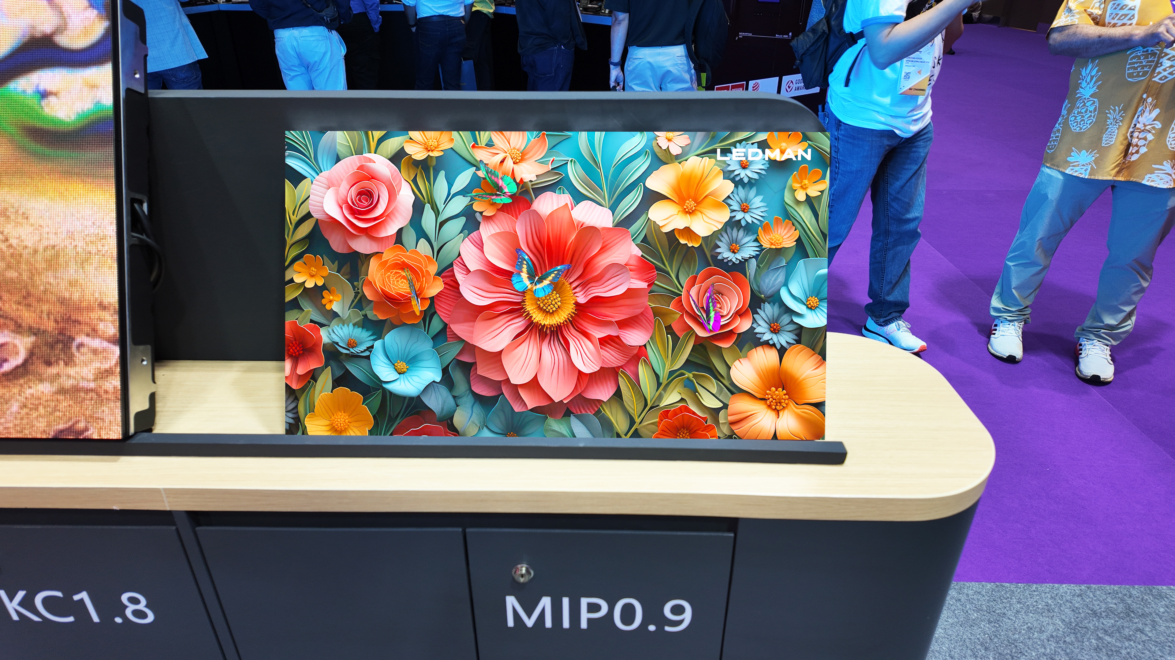 本次展會(huì)展出的Micro級(jí)MiP顯示樣箱,在環(huán)境適應(yīng)性、能效比和視覺(jué)體驗(yàn)上實(shí)現(xiàn)突破,適用于高端商業(yè)顯示、家庭巨幕等場(chǎng)景。0.9mm微間距為下一代Micro LED方案呈現(xiàn)更高像素密度與可靠性,為Micro LED普及提供技術(shù)路徑,也為現(xiàn)場(chǎng)用戶(hù)展示了更多未來(lái)顯示方案的可能性。