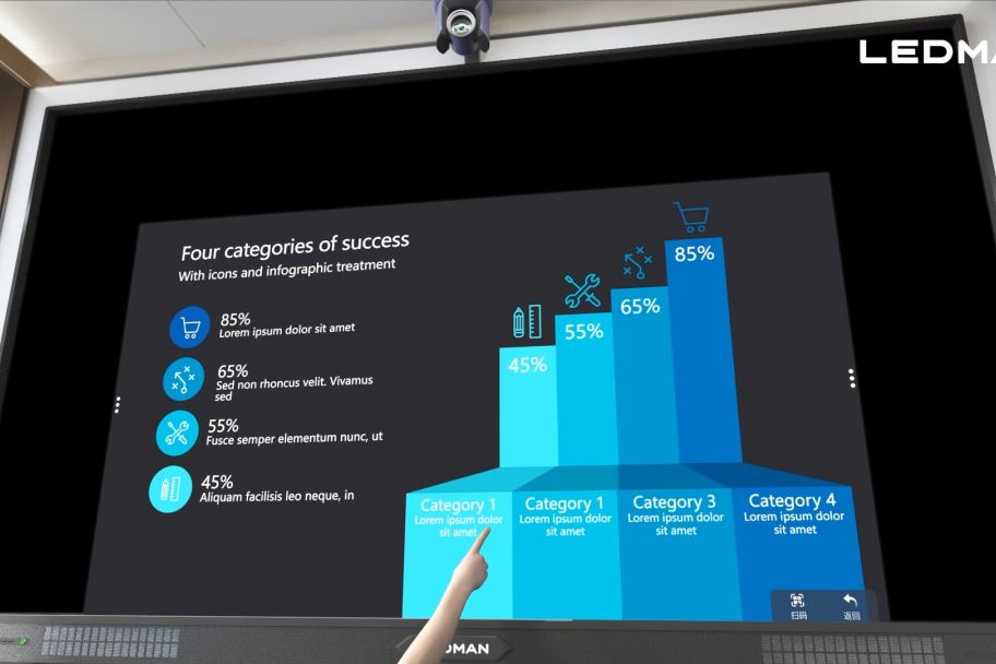 雷曼COB觸控交互一體機(jī)采用高靈敏度的觸控交互技術(shù),用戶通過簡單的觸控手勢就能實(shí)現(xiàn)觸摸控制、白板書寫、文本編輯、沙盤互動(dòng)等功能,大大降低操作難度,簡化了會議操作流程,提高了會議效率。