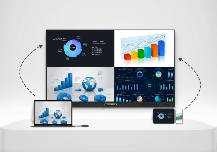 雷曼COB一體機(jī)支持無線投屏等多種投屏方式且支持投屏狀態(tài)下的觸摸反向控制功能,能夠兼容多種型號的設(shè)備,省去了多種設(shè)備之間復(fù)雜的連線和轉(zhuǎn)接。多設(shè)備同時(shí)投屏到大屏?xí)r,最多支持9分屏同投展示。靈活的投屏方式提升了信息的共享效率。