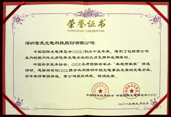 今年是中國國際光電博覽會創(chuàng)辦的第十五年,為了加強與光電企業(yè)和產(chǎn)業(yè)的聯(lián)系與合作,反映光電科技的進步,促進光電產(chǎn)業(yè)的發(fā)展,中國科學技術(shù)協(xié)會與中國國際光電博覽會主席團聯(lián)合舉辦了“卓越貢獻獎”評選活動,雷曼光電作為國內(nèi)LED行業(yè)的引領(lǐng)者憑借著為中國光電行業(yè)做出的努力和貢獻而收獲殊榮。